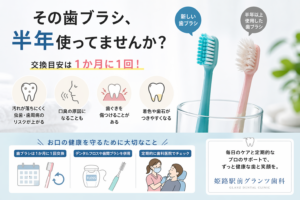 姫路駅前グランツ歯科では、患者さま一人ひとりのお口の状態に合わせた予防ケアやブラッシング指導、定期検診を丁寧に行っています。歯ブラシ選びに迷っている方、最近お口の不調が気になる方、しばらく歯医者に行っていない方も、どうぞお気軽にご相談ください。半年使った歯ブラシを替えることをきっかけに、これからのお口の健康習慣を一緒に見直していきましょう。