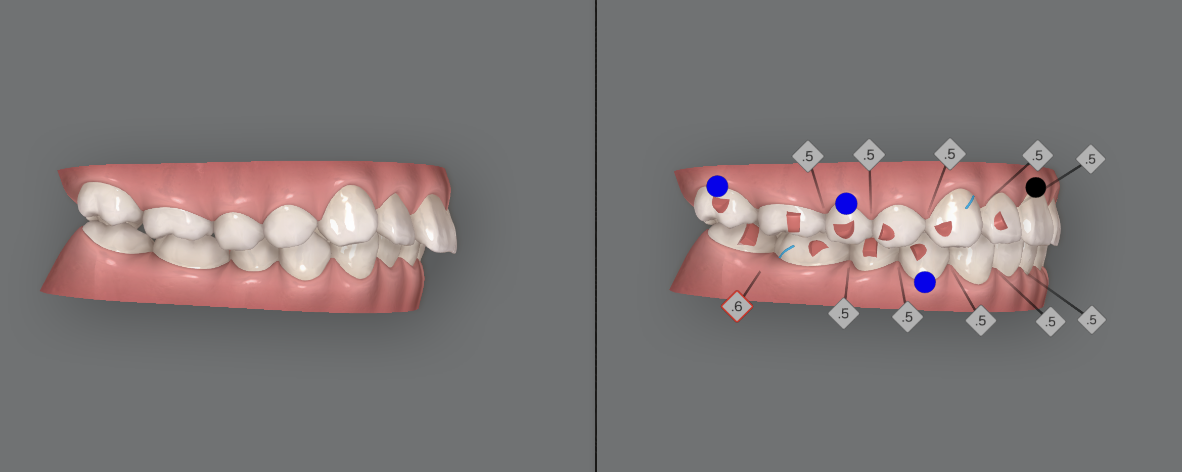設計図なので歯科医師がどう組み立てるかで治療結果は大きく変わります。もちろん無理な動きをクリンチェックで行うと歯は思い通りに動きませんし、歯が骨から逸脱してしまいグラグラになってしまうかもしれません。クリンチェックに必要なことは予測実現性です。