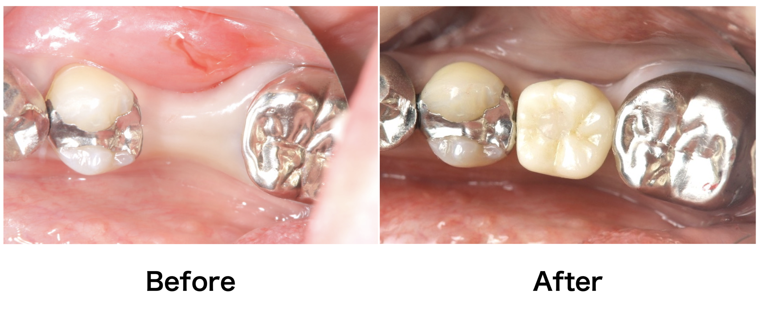 1. 最終上部構造の装着:歯科技工士が採取された型をもとに、周囲の歯と調和し、機能的にもしっかりと噛むことのできる。上部構造を製作します。それを装着し、咬み合わせや、色調を調整しながら、最終装着をします。