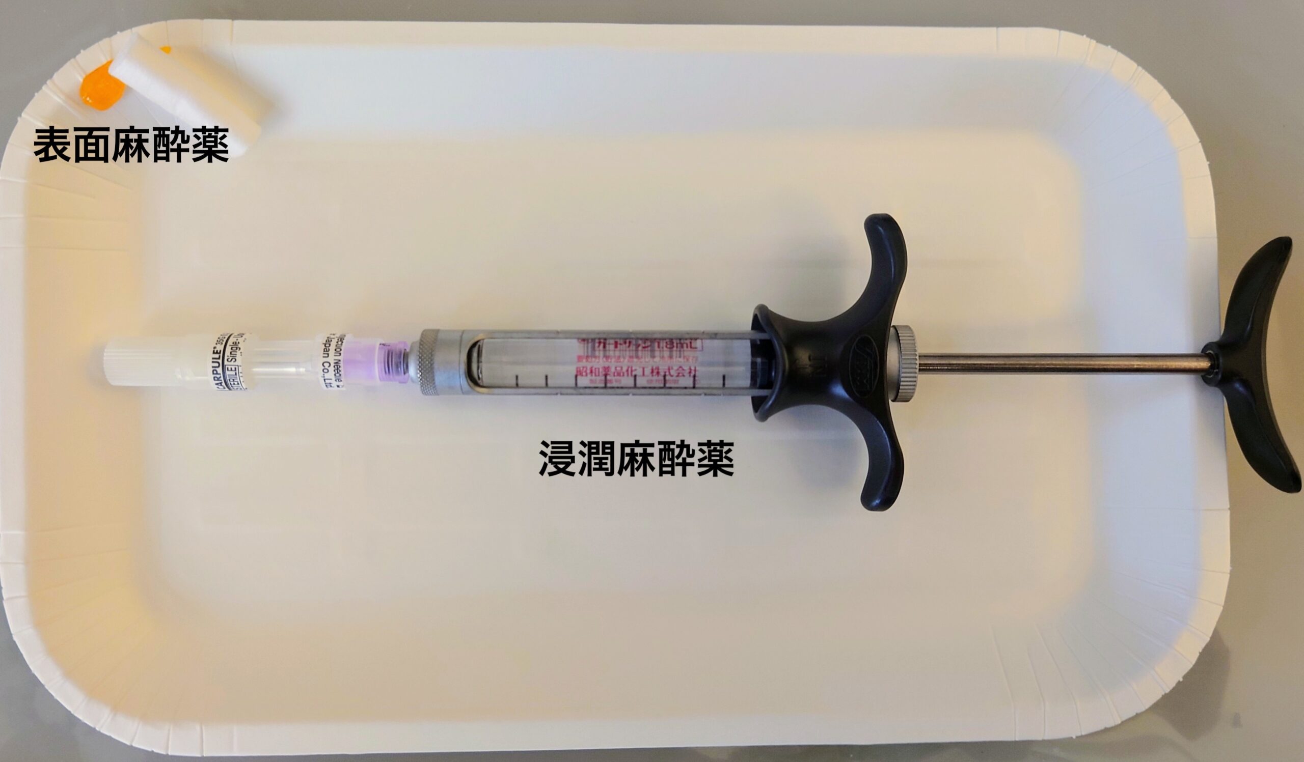 まず初めに麻酔する部位に表面麻酔薬というゼリー状の麻酔薬を塗布し刺入時の痛みを軽減させ